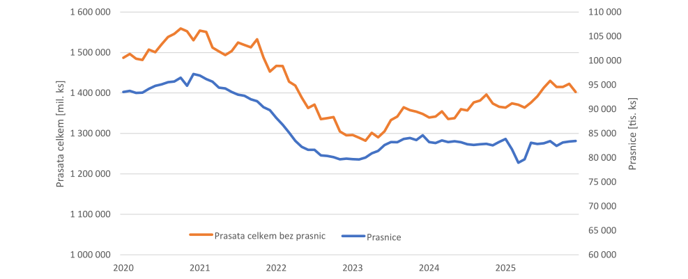 Stavy prasat u nás ukazují, že chovatelé sektoru příliš nevěří. Od krize v roce 2022 se stavy prasat neustále mírně zvyšují. Nejde o nijak dramatický vývoj, ale postupný růst ve výsledku znamená, že ve srovnání s nejnižšími stavy prasat celkem (1,28 mil kusů v březnu 2023) je už změna dobře patrná. Na konci roku 2025 bylo v Ústřední evidenci zapsáno 1,49 milionu prasat. To znamená navýšení skoro o 10 %. Ke stavům z počátku roku 2021, tedy z doby před začátkem poslední krize je to však stále ještě daleko. V té době bylo totiž evidovány 1,65 mil. kusů.